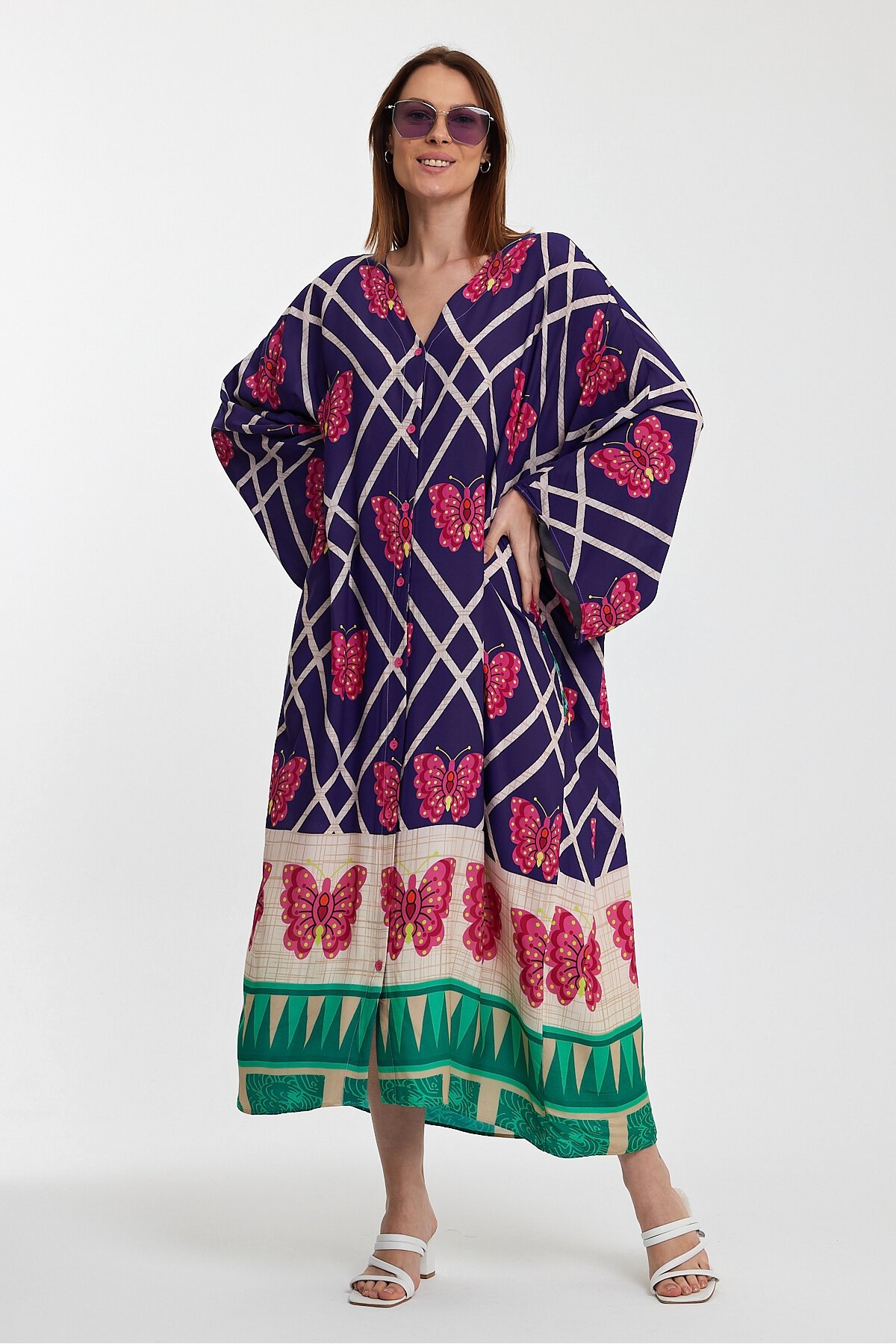 1032 Kadın Desenli Düğmeli Büyük Beden Otanik Gömlek Elbise
