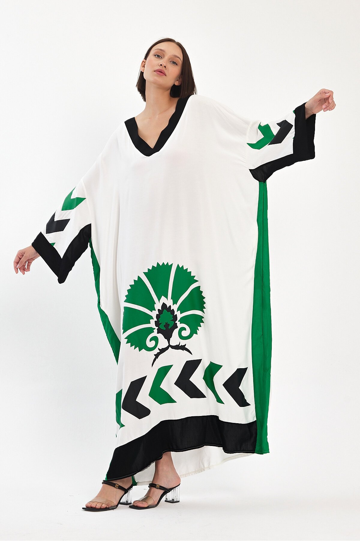 1034 Kadın V Yaka Etnik Desenli Büyük Beden Viskon Elbise