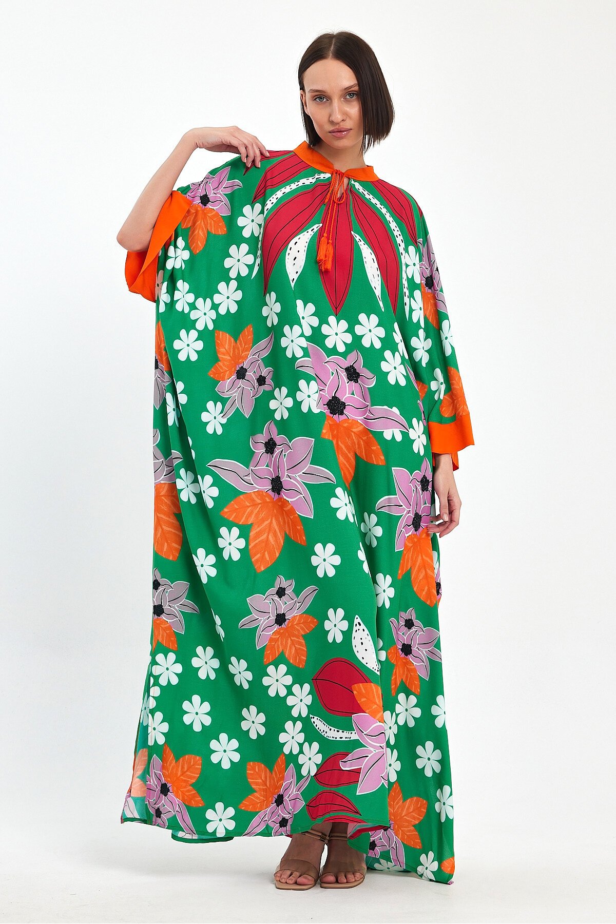 1069 Kadın Hakim Yaka Bağcıklı Desenli Standart Beden Etnik Elbise