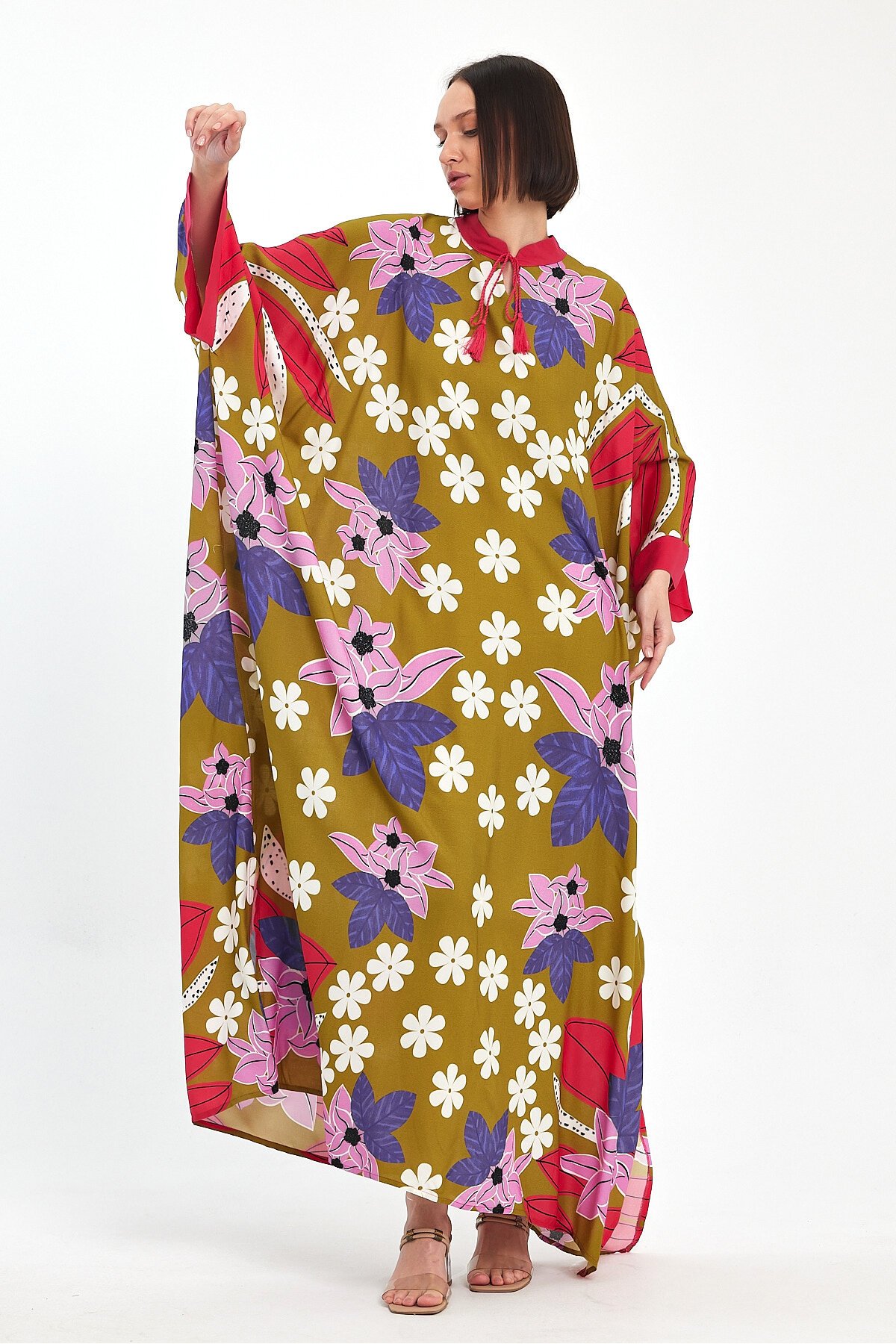 1069 Kadın Hakim Yaka Bağcıklı Desenli Standart Beden Etnik Elbise