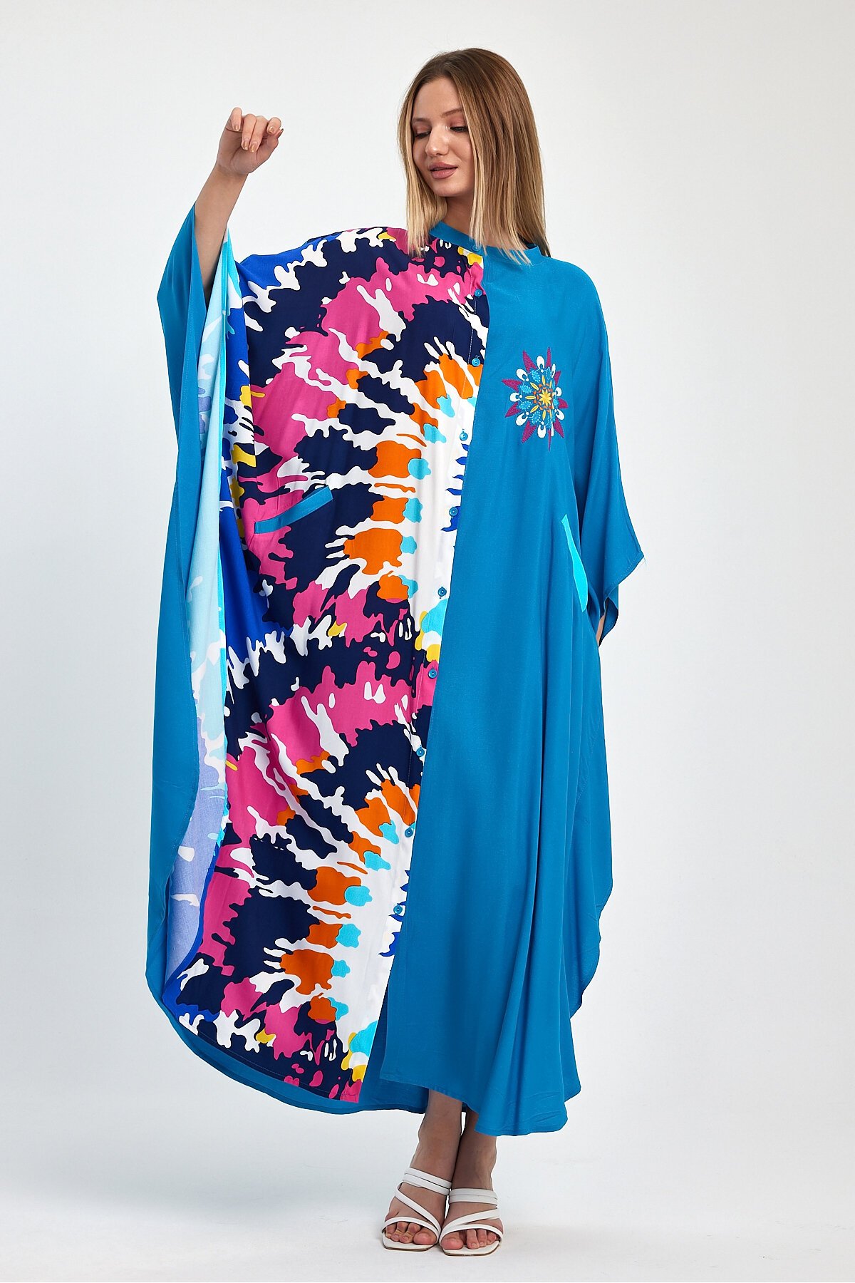 1076 Kadın Hakim Yaka Baskı Ve Nakış Detaylı Cepli Büyük Beden Gömlek Elbise
