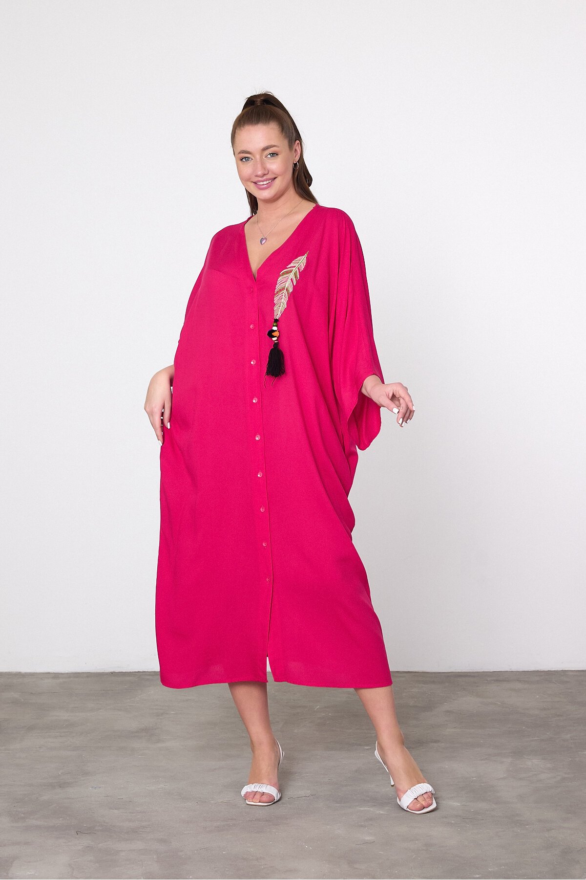 V039 Fuşya Kuş Tüyü Nakış Püskül Detaylı Büyük Beden Gömlek Elbise