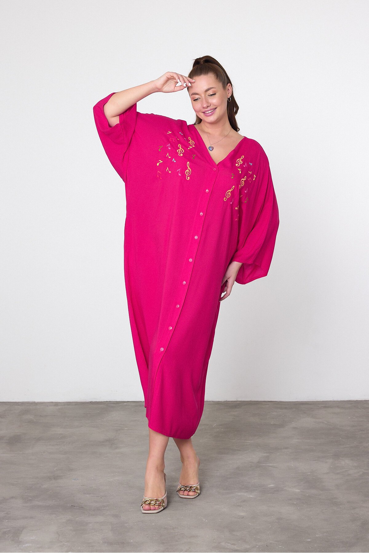 V040 Fuşya Kadın V Yaka Mini Nota Nakışlı Büyük Beden Gömlek Elbise
