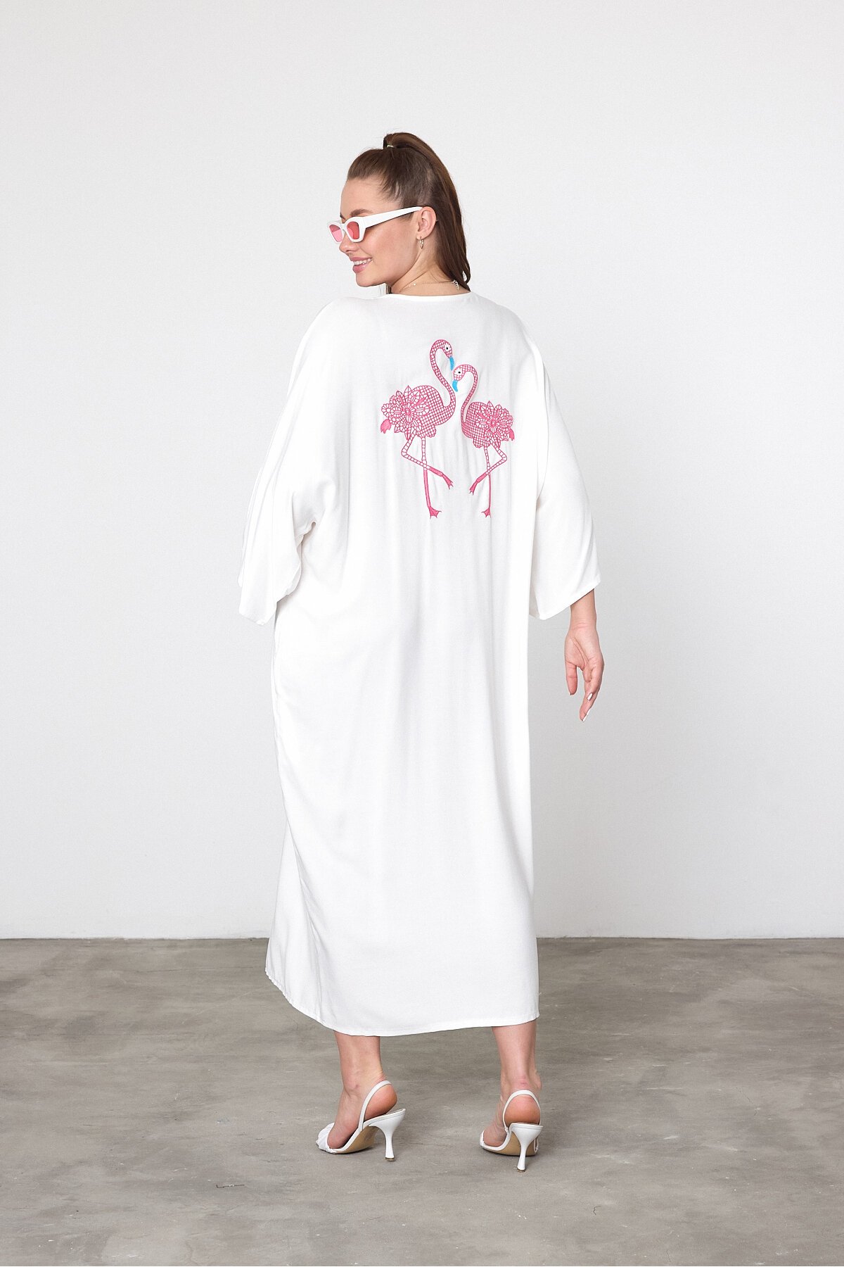 V049 Beyaz Kadın V Yaka Flamingo Nakışlı Büyük Beden Gömlek Elbise