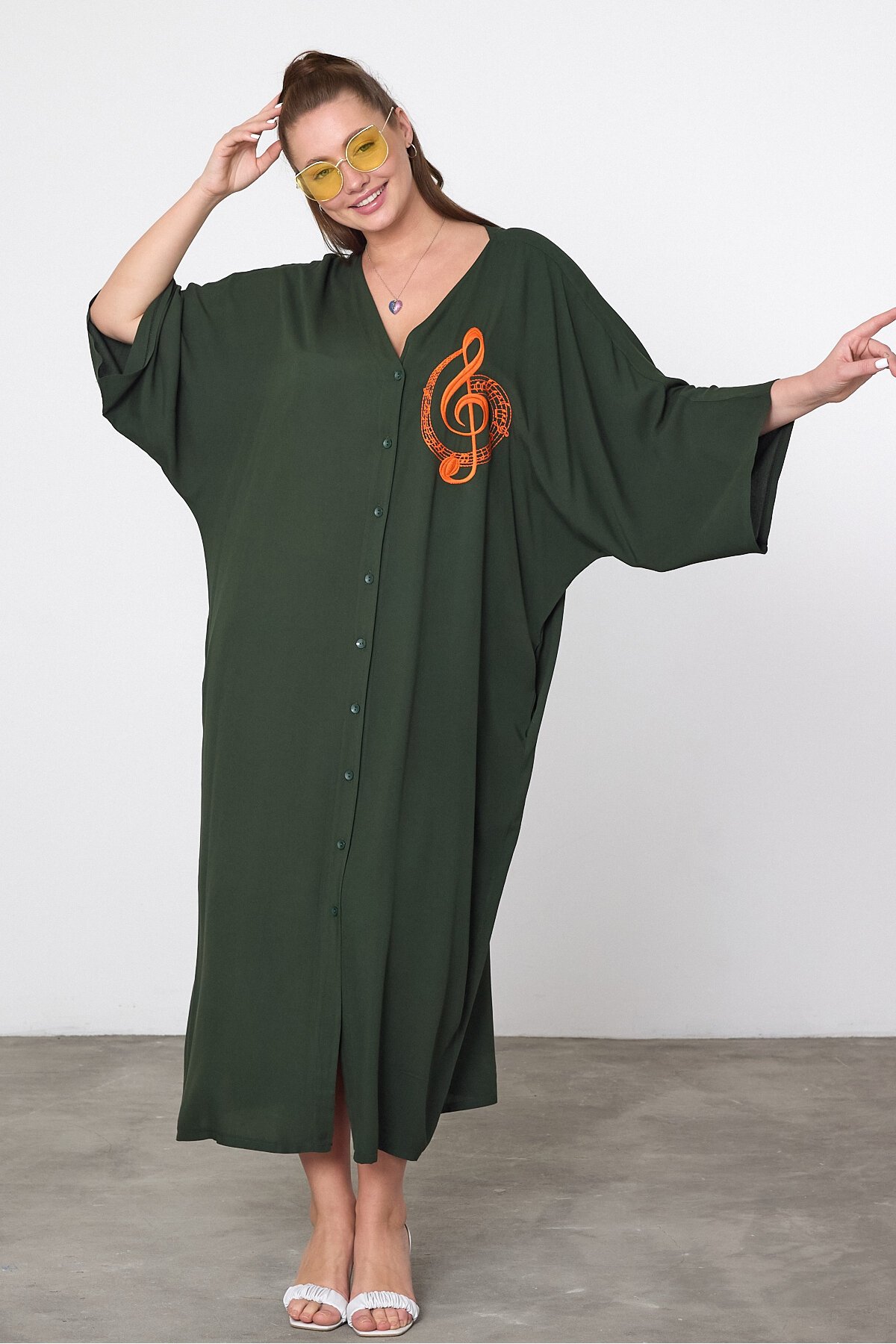 V050 Haki Kadın V Yaka Düğme Kapalı Nota Nakış Detaylı Büyük Beden Gömlek Elbise